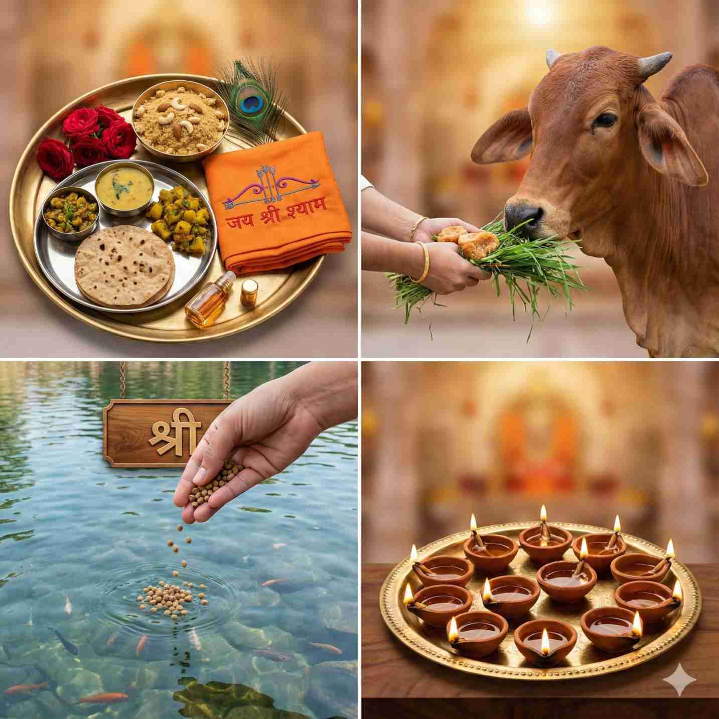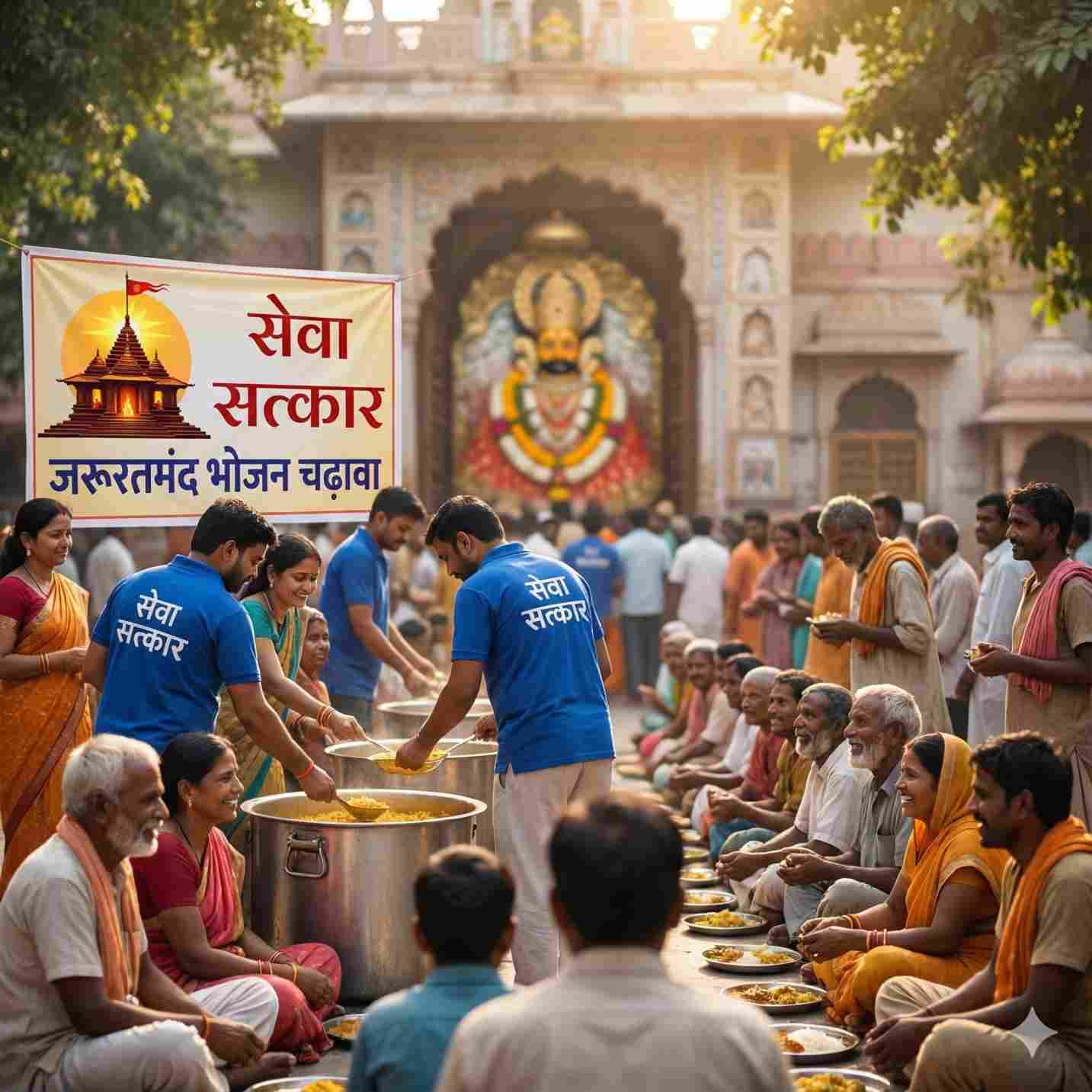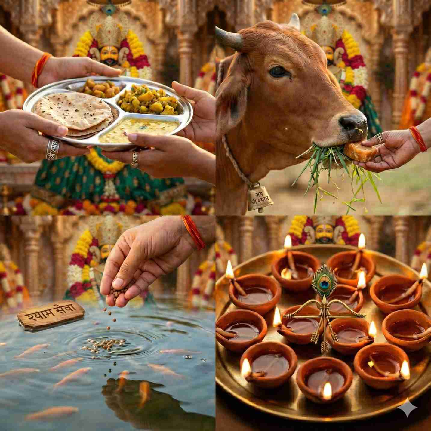 हमारे यहाँ कई प्रकार के भक्ति चढ़ावे उपलब्ध हैं — जैसे दीपदान कॉम्बो, गौ-सेवा , ब्राह्मण भोज कॉम्बो, जरूरतमंद भोजन , मोरपंख समर्पण, गुलाब अर्पण, चूरमा प्रसाद, इत्र सेवा, निशान समर्पण आदि।