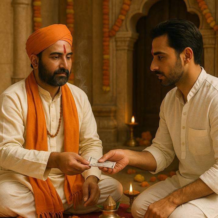 पंडित जी को सम्मानपूर्वक दक्षिणा अर्पित करने की परंपरा, श्रद्धा और आभार का प्रतीक।