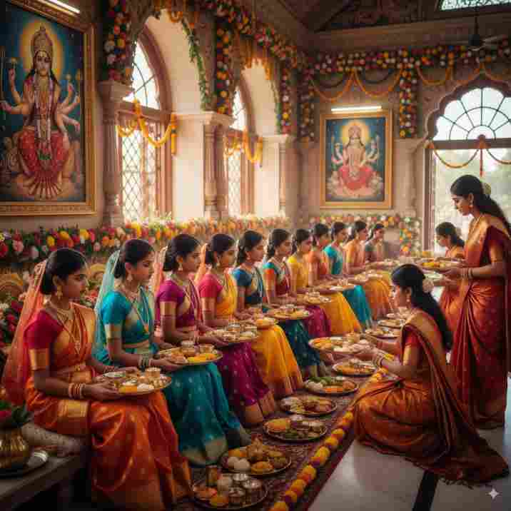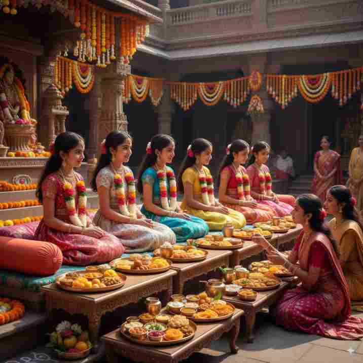 9 कन्याओं का पूजन, माँ दुर्गा के नौ रूपों का आशीर्वाद पाने हेतु।