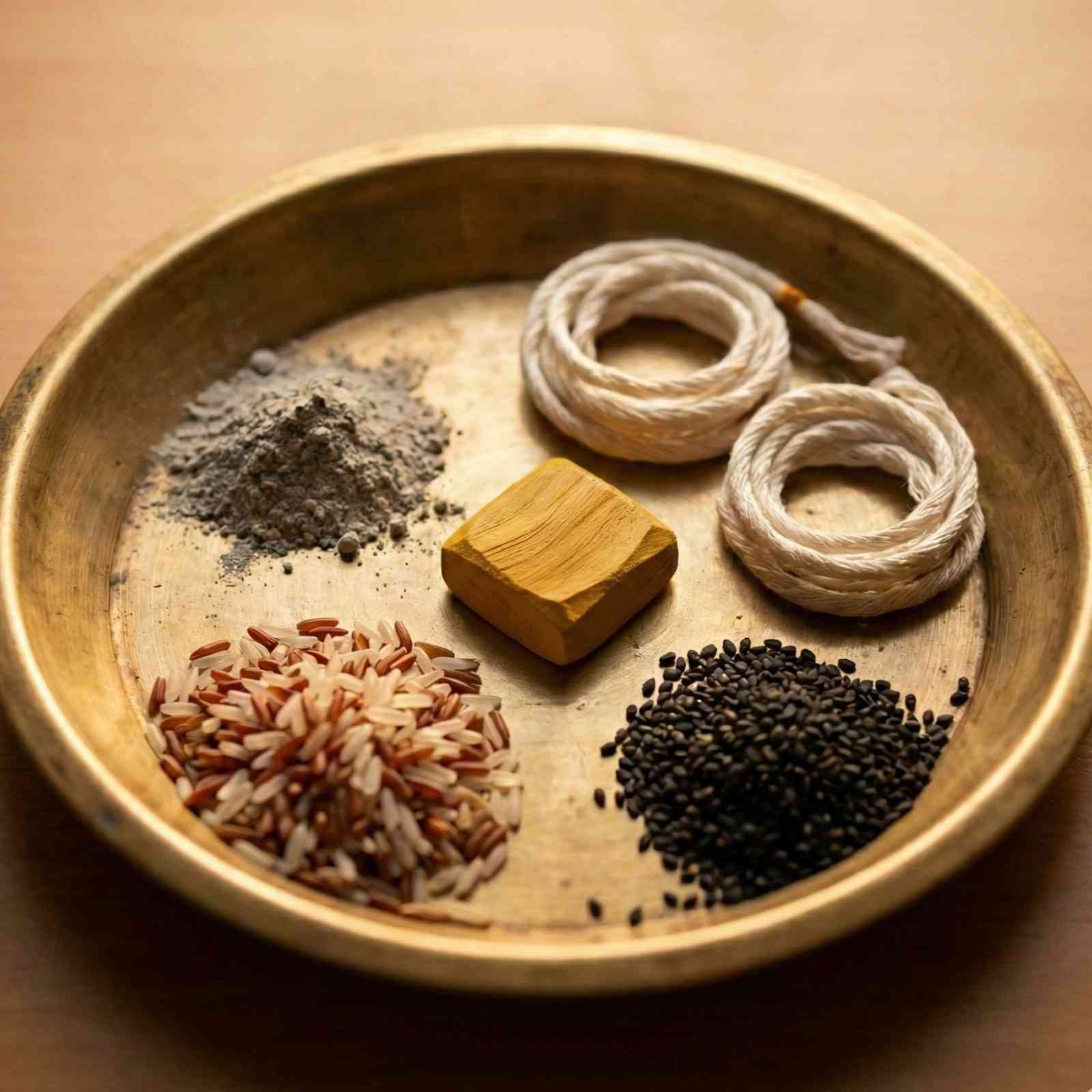 For the completion of the puja, sacred offerings of vibhuti (holy ash), sandalwood paste, akshat (unbroken rice), janeu (sacred thread), and black sesame seeds will be ceremoniously offered according to proper rituals.