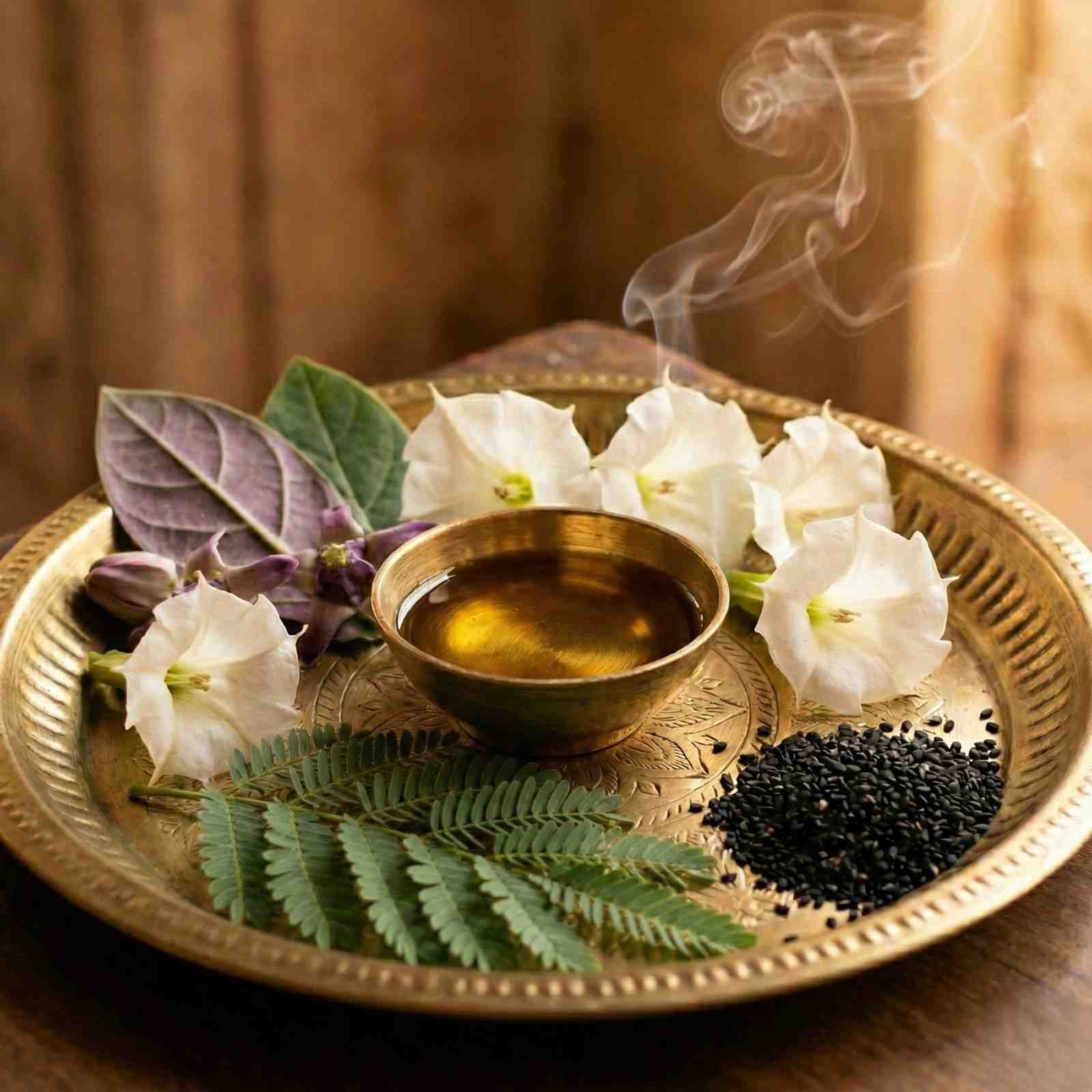 Offering Datura, Aak flowers, and Shami leaves to remove suffering and negativity (“poison”) from life—especially beneficial for Shani (Saturn) peace and relief.