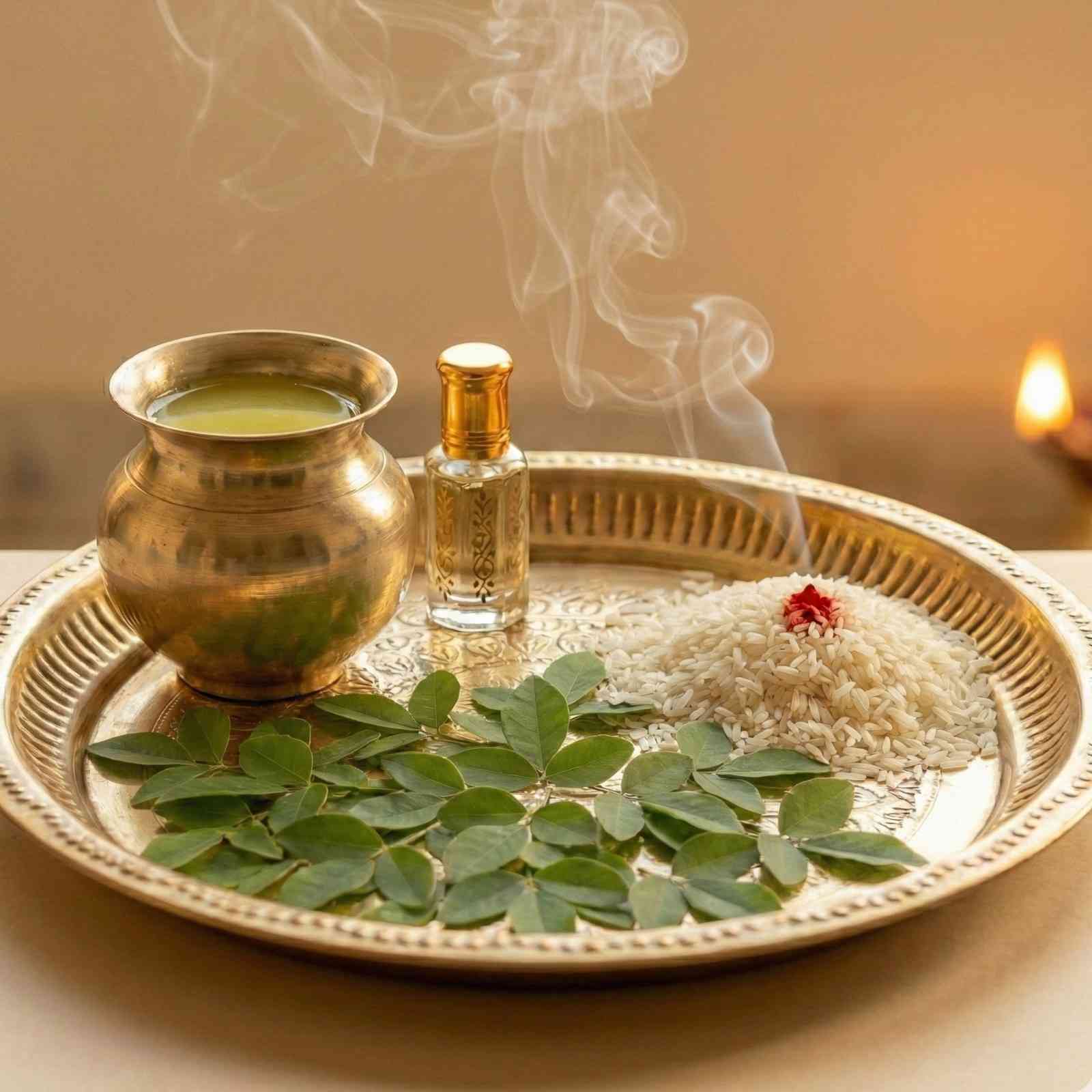 Sugarcane Juice + Ittar Seva + 108 Bilva Leaves + Akshat (Rice)