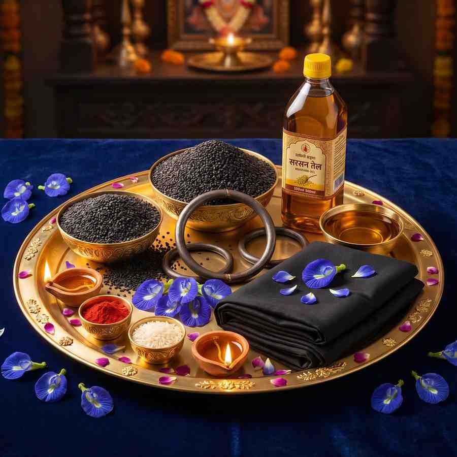 500ml सरसों तेल, काले तिल, काला कपड़ा, लोहे का छल्ला, और नीले फूल।