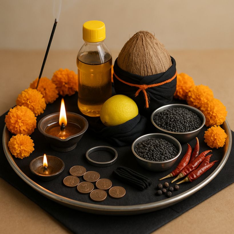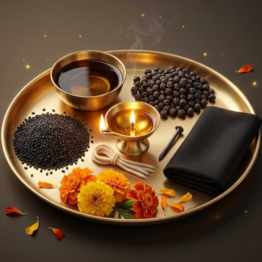 सरसों तेल, काले तिल एवं काला/नीला वस्त्र सहित शनि दोष शांति हेतु पवित्र …
