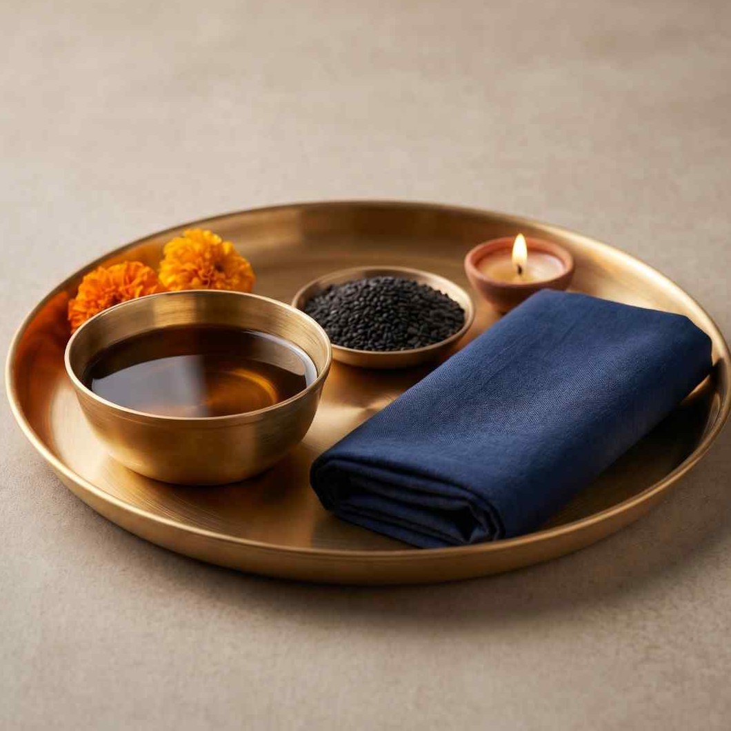 सरसों तेल, काले तिल एवं काला/नीला वस्त्र सहित शनि दोष शांति हेतु पवित्र अर्पण सामग्री